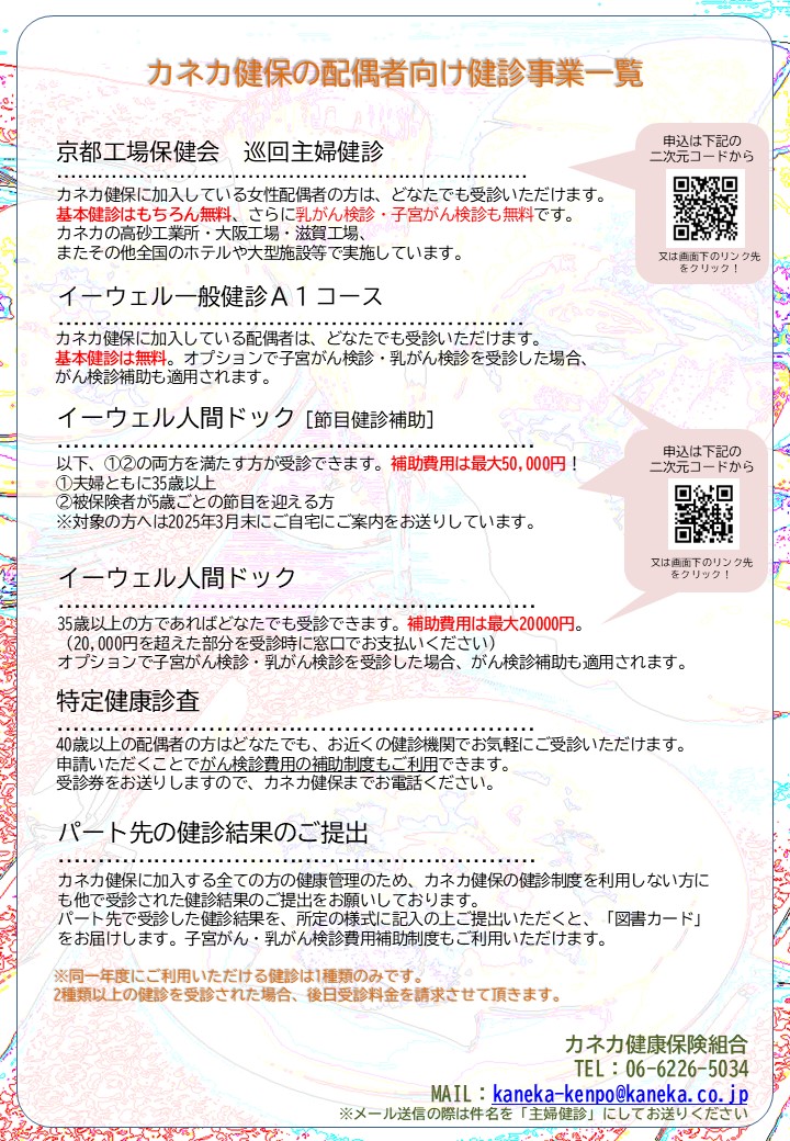 カネカ健保の女性配偶者向け健診事業一覧 2025年07月03日 京都工場保健会の健診申込みはコチラ ※パスワードがご不明の場合は「主婦健診受診ご案内」11ページをご参照、またはカネカ健康保険組合までお気軽にお問合せください♪ イーウェル一般健診A1コースまたは人間ドックお申込みはコチラ パート先の健診結果のご提出に関するご案内はコチラ 次の記事へ前の記事へ